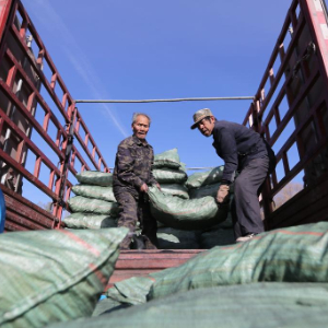 11月19日,甘肅省定西市安定區內官營鎮先鋒村村民在搬運政府發放的取暖用煤。