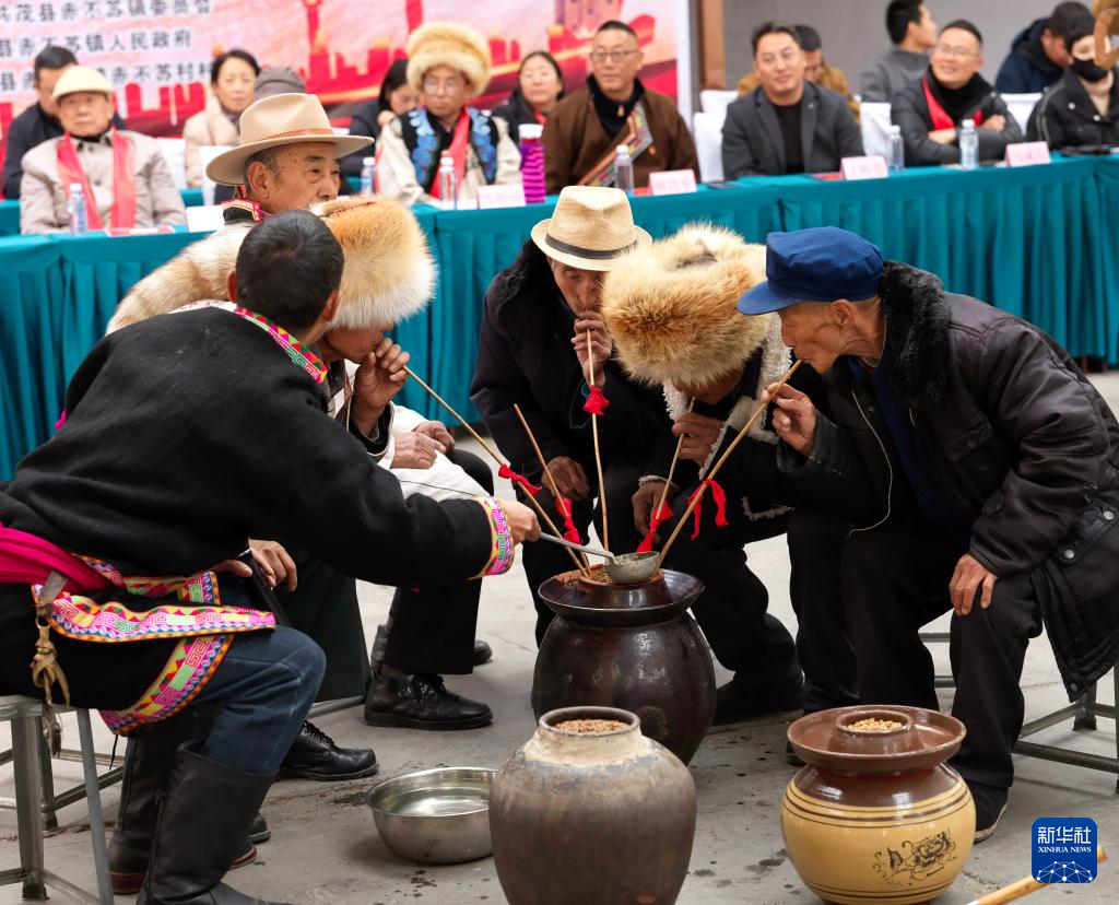 11月18日,在茂縣赤不蘇鎮,當地群眾一起喝咂酒。