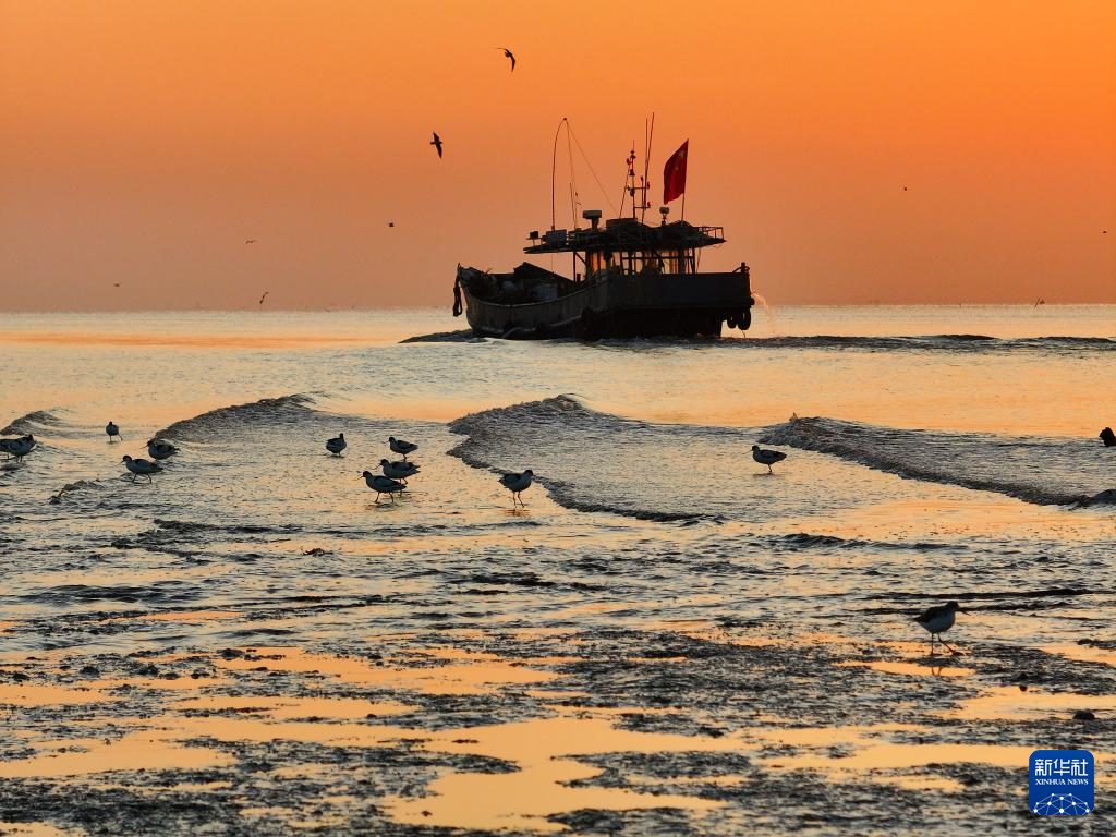 11月19日,海鳥在江蘇省連云港市贛榆區沿海濕地里覓食(無人機照片)。