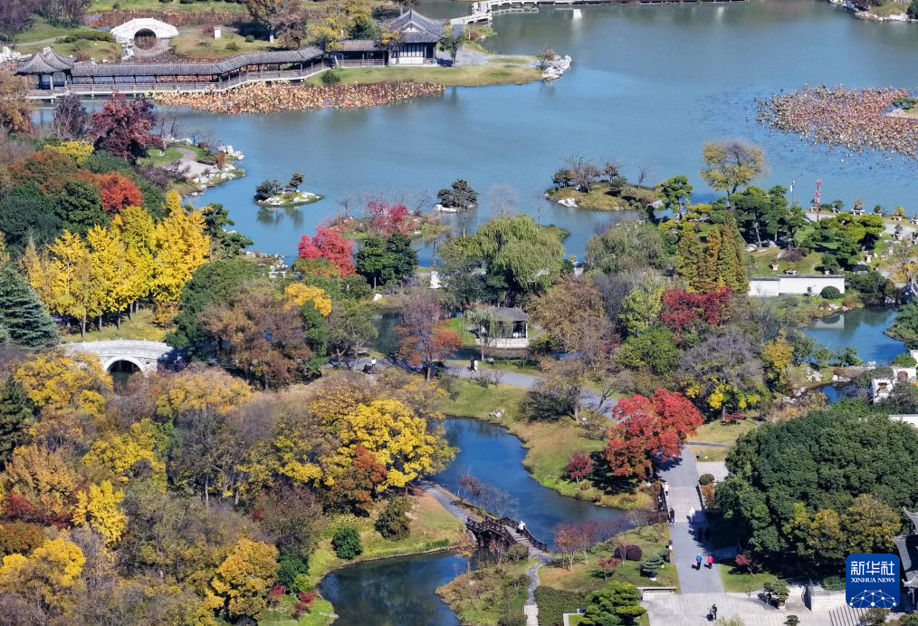 11月19日,游客在江蘇省蘇州市拙政園游玩(無人機照片)。