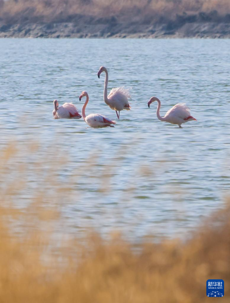 11月19日,火烈鳥在山西運城鹽湖棲息。