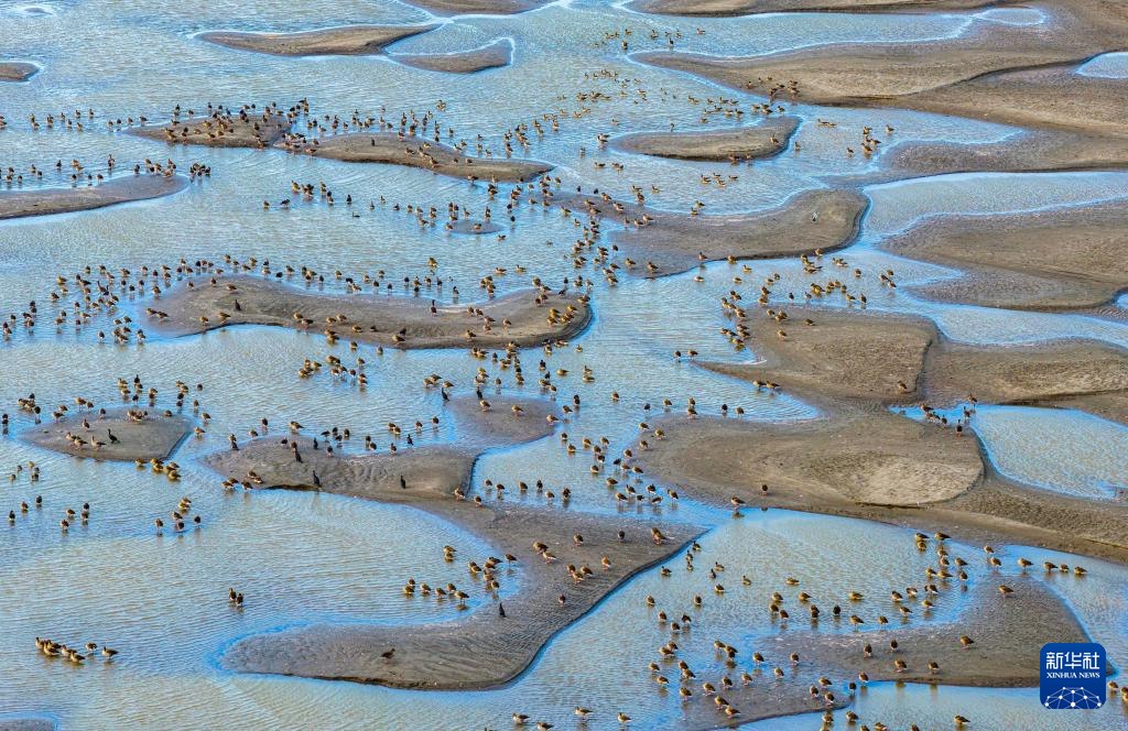 11月20日,在浙江省溫嶺市東海塘,越冬候鳥在水面游弋。