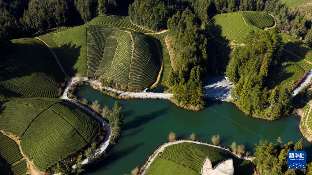 11月20日拍攝的湖北省恩施土家族苗族自治州鶴峰縣走馬鎮楊柳池茶園(無人機照片)。