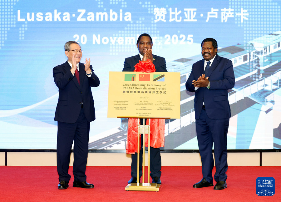 當地時間11月20日,國務院總理李強在盧薩卡同贊比亞總統希奇萊馬、坦桑尼亞副總統恩欽比共同出席坦贊鐵路激活項目開工儀式。