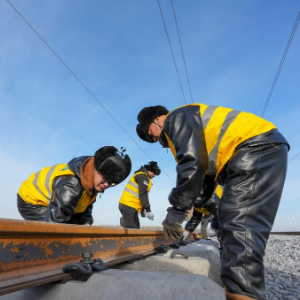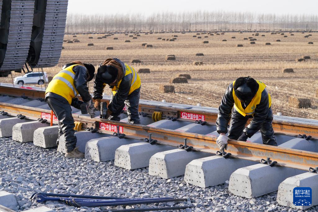 11月25日,工人在黑龍江省綏化市慶安縣永華村哈伊高鐵哈鐵段鋪軌現場工作。