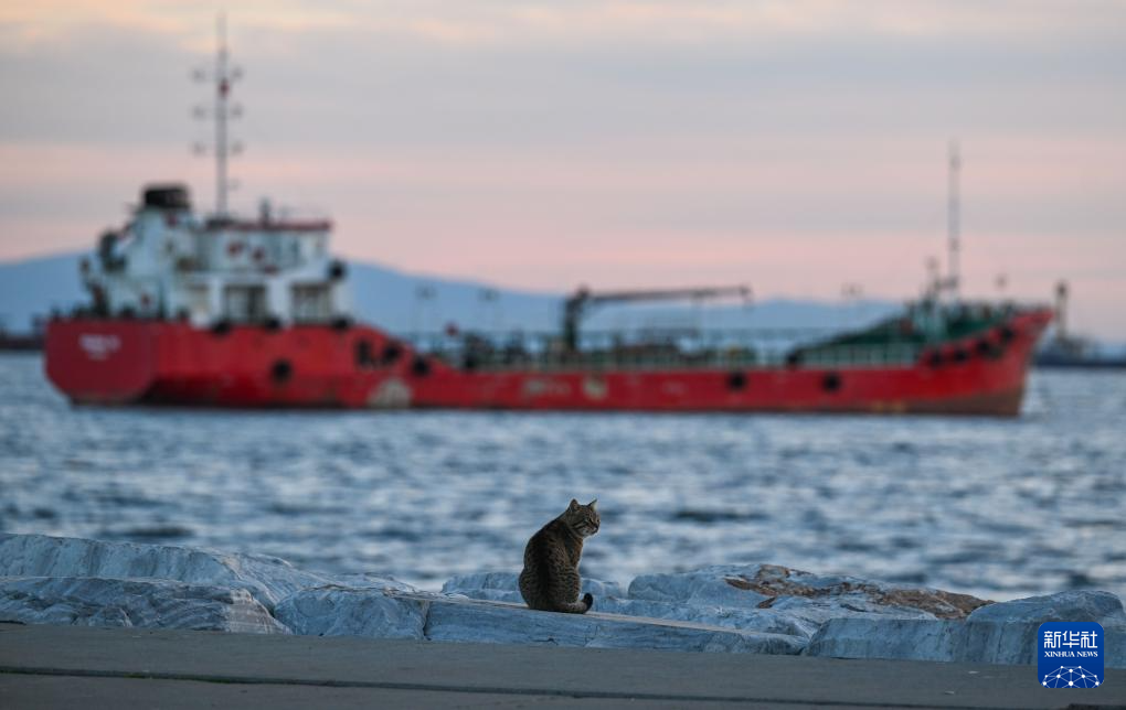 11月25日,一只貓在土耳其伊斯坦布爾馬爾馬拉海岸邊休憩,不遠處的海面上停泊著一艘船。