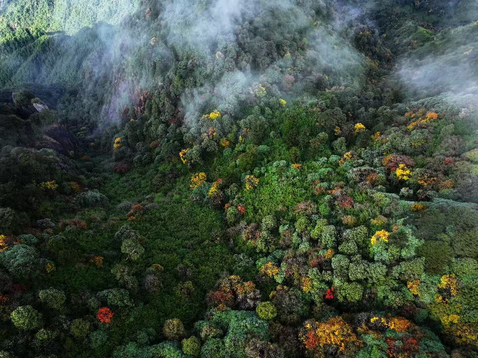 初冬時節,走進云南省騰沖市猴橋鎮輪馬村粉竹壩,層林盡染,五彩斑斕,彩色山林如巨幅油畫鋪展于群山之間。薄霧繚繞中,山林靜謐而幽遠,構成一幅濃墨重彩的冬日畫卷。