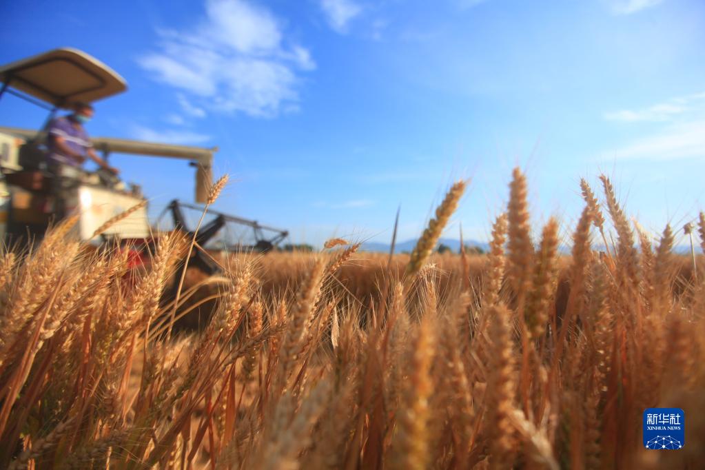 6月8日,收割機在山東省臨沂市平邑縣的麥田里收割小麥。新華社發(武紀全 攝)