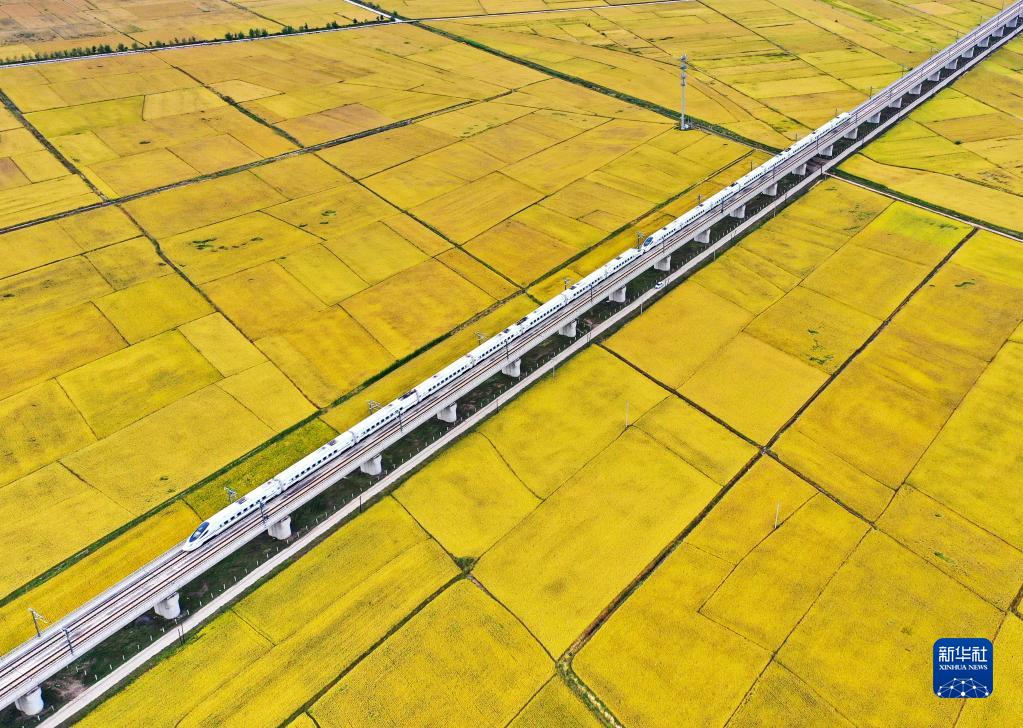 9月19日,高鐵列車從吉林省公主嶺市沃野間駛過(無人機照片)。新華社記者 張楠 攝