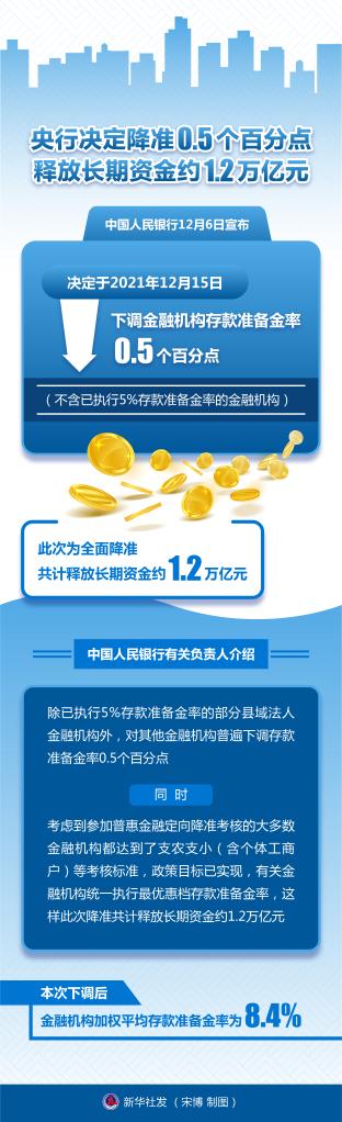 中國人民銀行12月6日宣布,決定于2021年12月15日下調金融機構存款準備金率0.5個百分點(不含已執行5%存款準備金率的金融機構)。此次為全面降準,共計釋放長期資金約1.2萬億元。新華社發 宋博 制圖