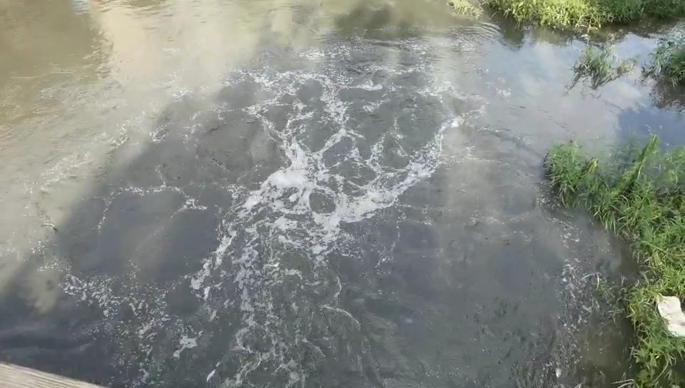 督察組現場督察發現,平房污水處理廠排口漂浮大量泡沫。督察組供圖