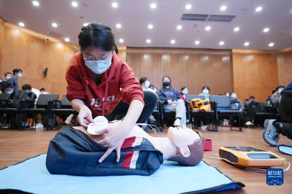 2021年11月28日,清華大學舉辦面向冬奧學生志愿者的“心肺復蘇及AED使用急救技能”工作坊,這是冬奧學生志愿者在急救技能培訓上學習使用自動除顫器。新華社記者 鞠煥宗 攝