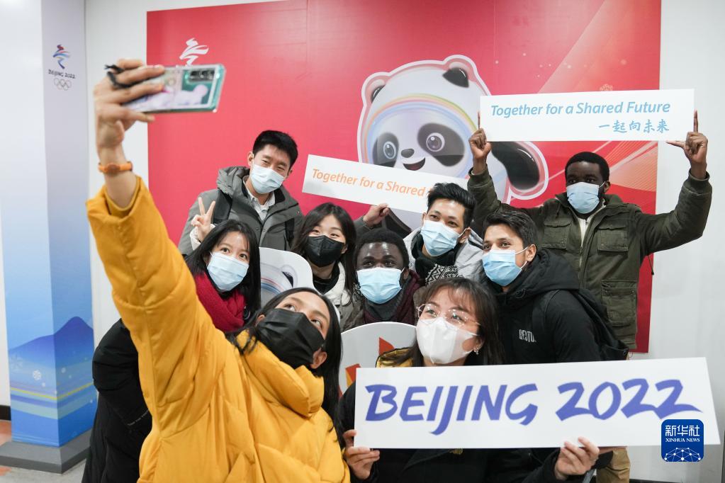 2021年12月30日,參加場館培訓的外籍志愿者在北京五棵松體育中心合影。新華社記者 鞠煥宗 攝