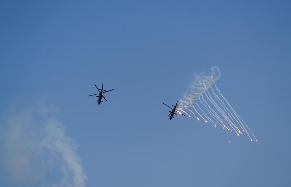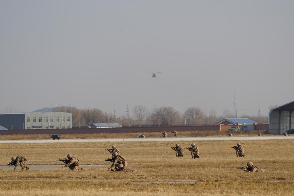 現場官兵身著21式冬作訓服,全副武裝、士氣高昂,30余架戰鷹劃破長空,接連完成先期火力打擊、機降戰斗等課目。