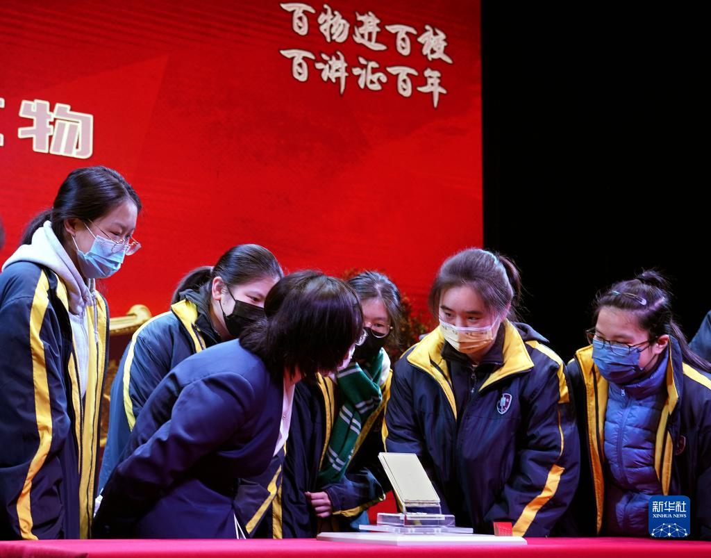 2022年1月4日,中共一大紀念館的工作人員帶著館藏的革命文物——1949年5月華東軍區司令部在解放上海前夕印制的《入城紀律》冊子,走進上海市格致中學,給師生們上了生動而難忘的“新年第一課”。這是中共一大紀念館的文物保管人員與觀看文物的學生交流。新華社記者 劉穎 攝