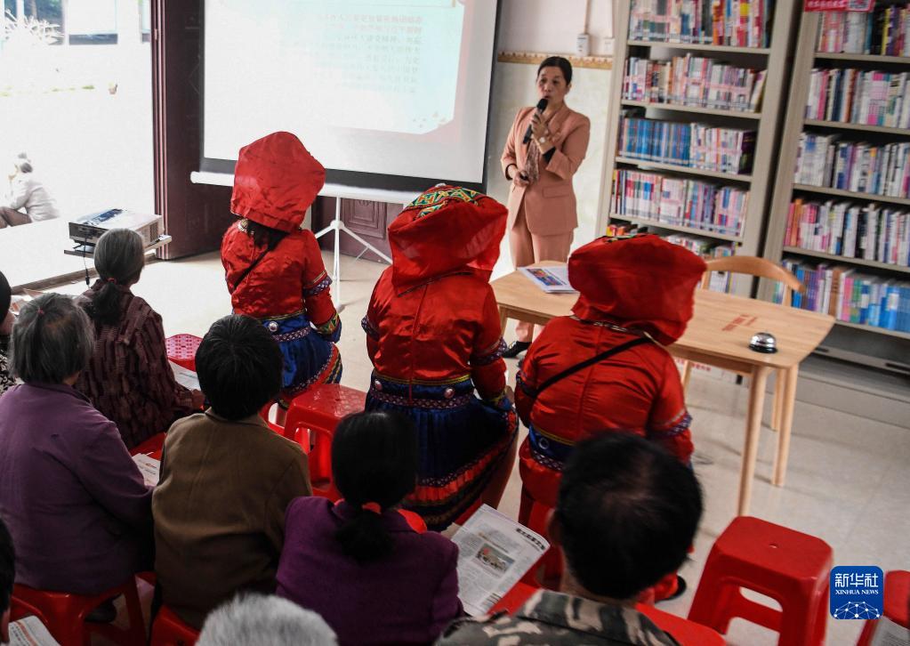 2021年11月19日,在廣西欽州市欽北區大寺鎮那布村農家書屋,宣講員向村民宣講十九屆六中全會精神。新華社記者 張愛林 攝