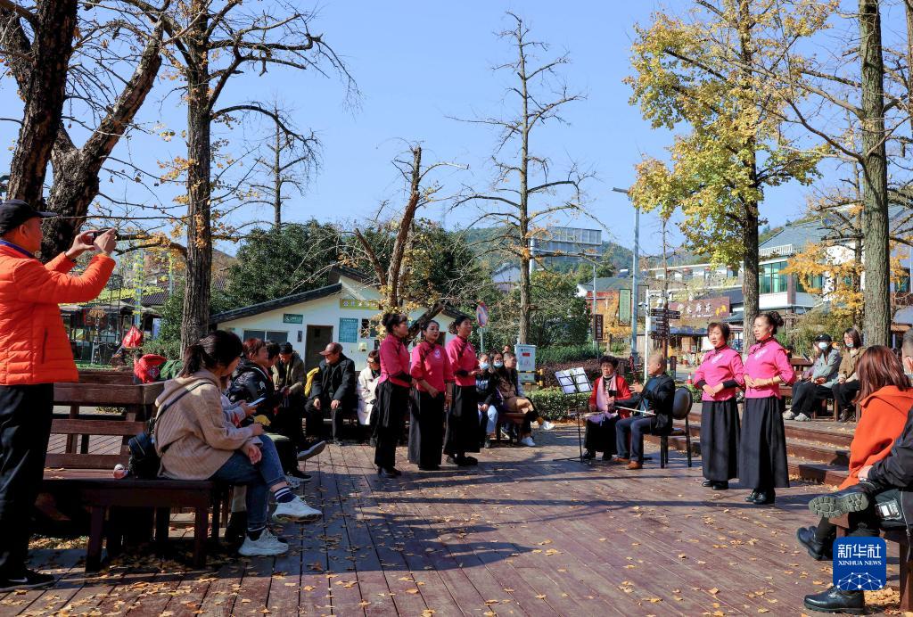 2021年11月25日,在浙江省湖州市長興縣小浦鎮方一村,戲曲愛好者將六中全會精神融入戲曲,自編自導自演地方特色灘簧戲。新華社記者 徐昱 攝