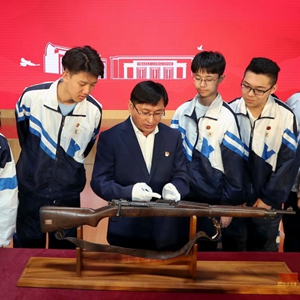 2021年10月25日,上海中學的學生近距離觀看革命文物——上海支前工人李增祥擊落美機時所用M1903步槍。這堂特別的思政課是中共一大紀念館“百物進百校,百講證百年”活動的第一講。新華社記者 劉穎 攝