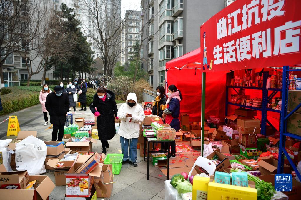1月7日,居民在西安曲江新區一小區內的生活便利店前排隊購買食品。新華社記者 邵瑞 攝