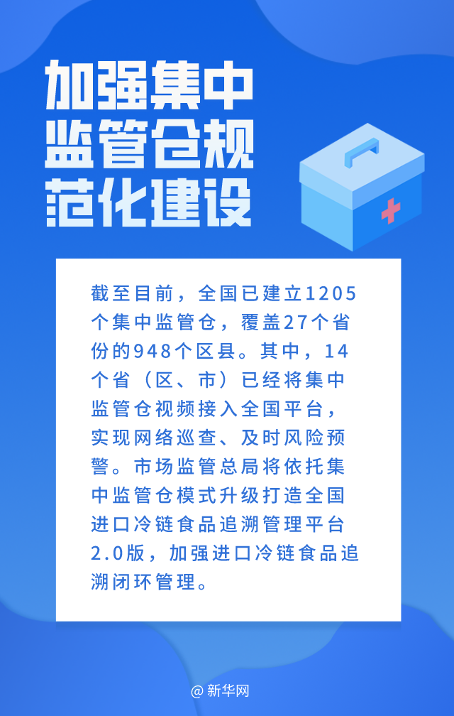 截至目前,全國已建立1205個集中監管倉,覆蓋27個省份的948個區縣。其中,14個?。▍^、市)已經將集中監管倉視頻接入全國平臺,實現網絡巡查、及時風險預警。市場監管總局將依托集中監管倉模式升級打造全國進口冷鏈食品追溯管理平臺2.0版,加強進口冷鏈食品追溯閉環管理。