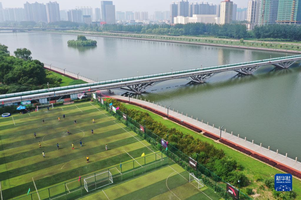 市民在太原市汾河畔的公園內踢足球(無人機照片,2019年7月28日攝)。新華社記者 楊晨光 攝