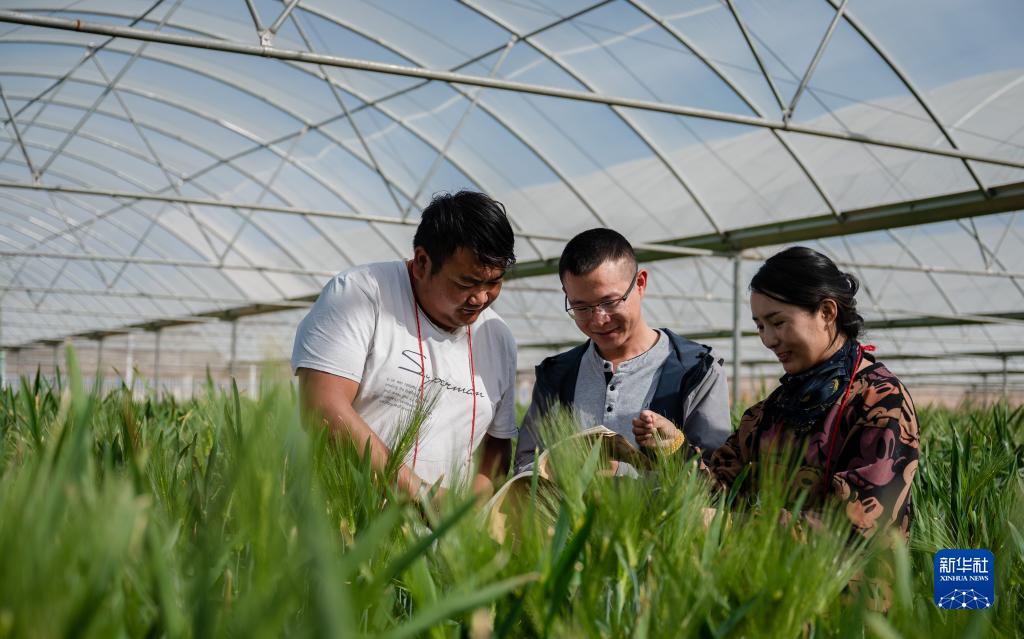 1月11日,在元謀縣青稞育種和加代擴繁基地內,危文波(中)在與同事交流。新華社記者 王冠森 攝