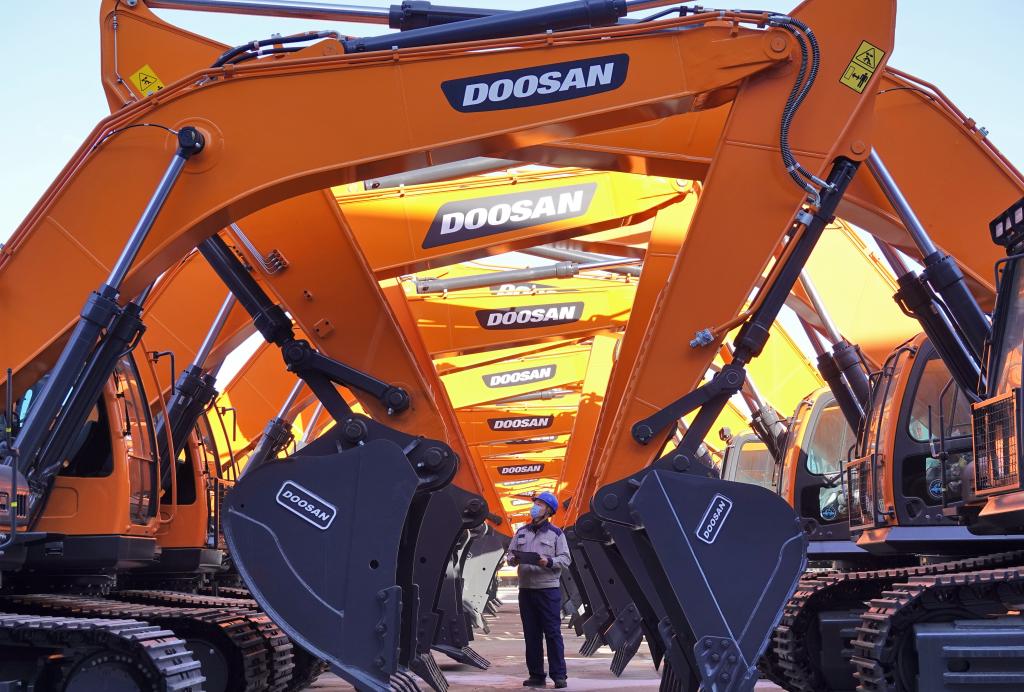 2022年1月17日,在山東煙臺開發區一家工程機械有限公司,工作人員對出廠車輛進行檢查。新華社發(唐克攝)