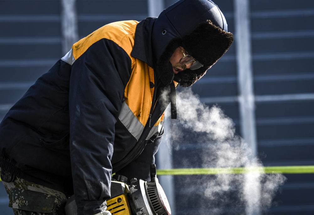 鐵路沿線上,工務段員工正在抓緊列車運行的窗口期,對鐵軌進行搗固檢修作業,確保行駛安全。這是項體力活,沉重的機器猛烈震動著,仿佛要掙脫操作者的手,使出渾身勁的工作人員口中不時呼出熱氣,而寒意不斷從冷冰冰的鐵軌上透過他們的鞋往上傳。