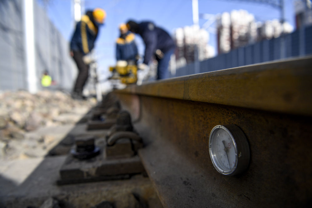 ↑2021年1月6日,中鐵蘭州局銀川工務段職工進行搗固作業。
