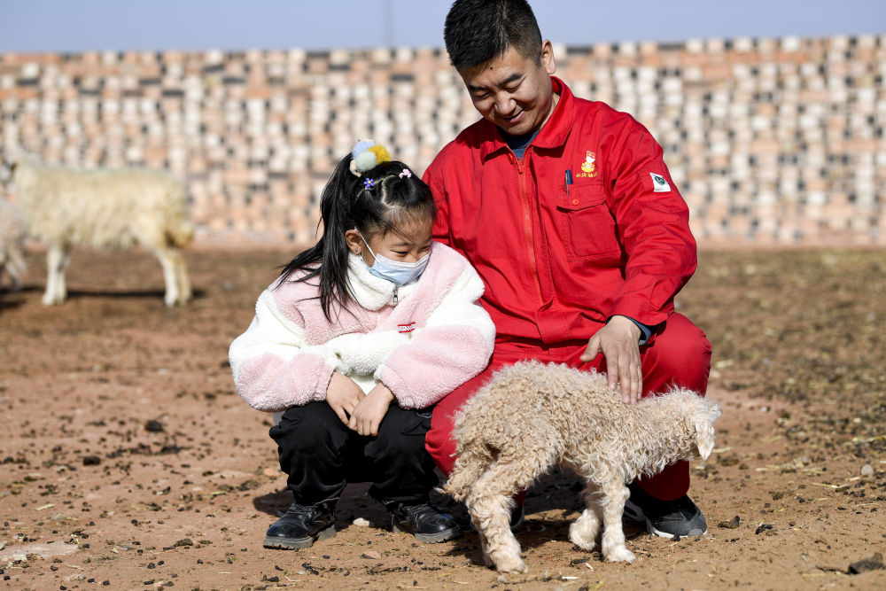↑7歲的王思淇第一次來到爸爸王濤駐村的紅井子村,她對一切都充滿了好奇。2021年2月11日,王濤和王思淇在撫摸一只農戶家的小羊羔。