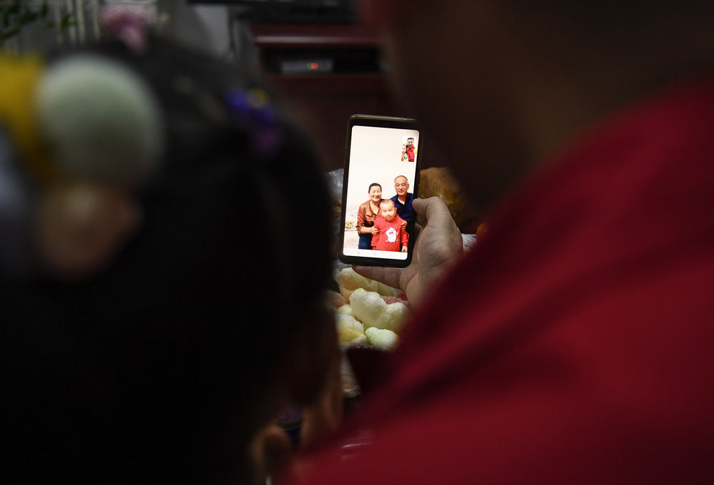 ↑2021年2月11日除夕夜,王濤和妻子女兒在宿舍同在銀川的父母和2歲的兒子通視頻電話。