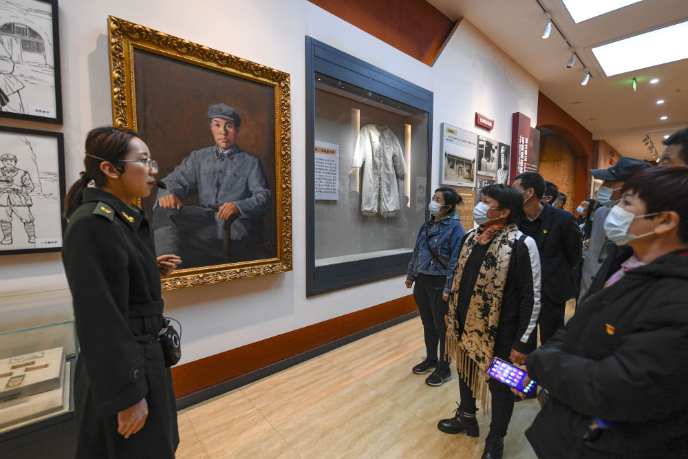 ↑2021年4月15日,寧夏鹽池縣革命烈士紀念館講解員(左一)為前來參觀的游客介紹毛澤民在鹽池縣的故事。