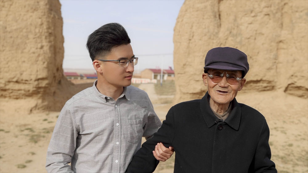 ↑新華社記者馮開華(左)向其太爺馮振林了解毛澤民與羊皮大氅的故事(視頻截圖)。