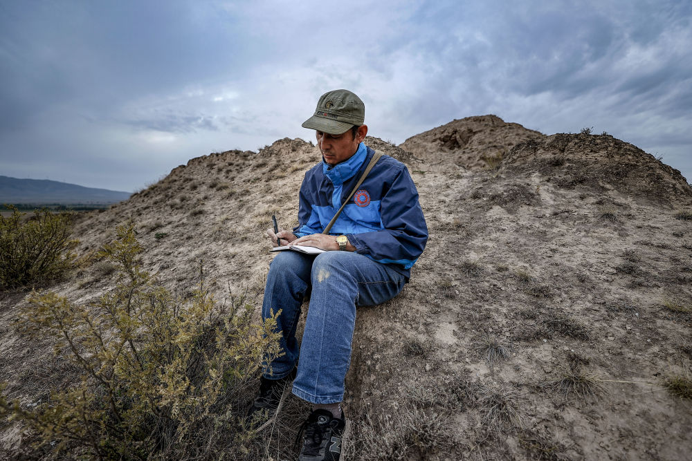 ↑2021年8月12日,李世翔在寧夏海原縣巡查陳家灣烽火臺時做筆記。