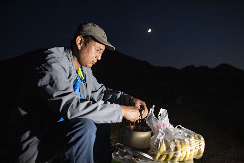 ↑2021年8月13日晚,李世翔在寧夏銀川市境內的三關口土夯明長城附近吃晚飯。為節省時間和開支,他自帶了泡面、餅子和咸菜。