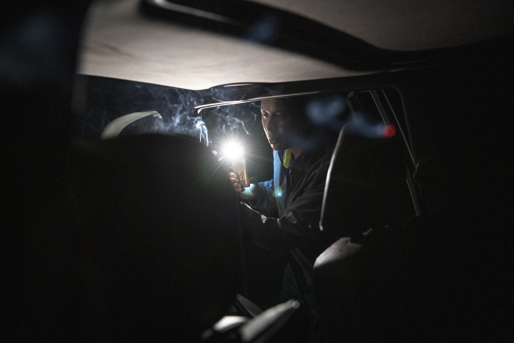 ↑2021年8月13日晚,李世翔在車里點起蚊香,當晚他在寧夏銀川市境內的三關口土夯明長城附近露宿。