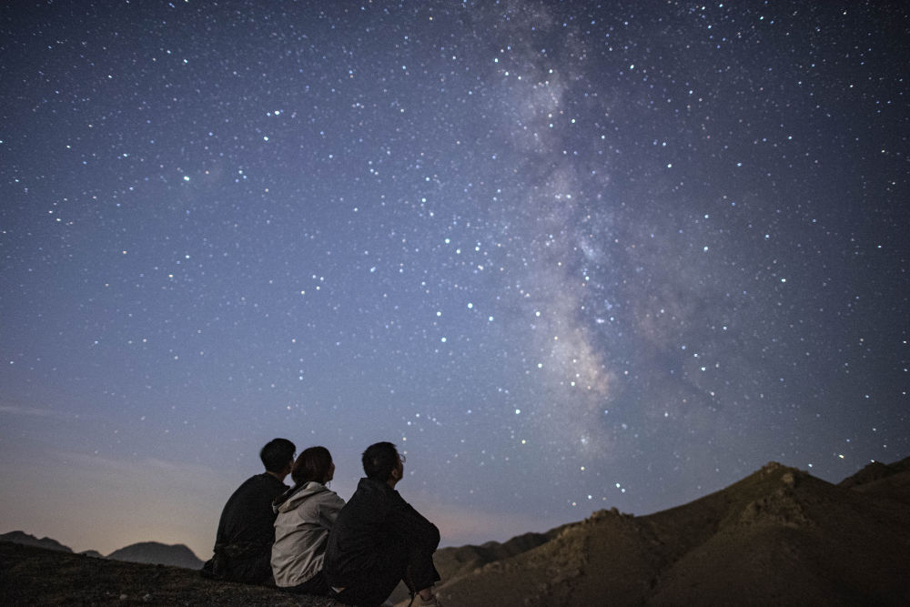 ↑新華社記者馮開華、馬思嘉和唐如峰(從左至右)采訪結束后,在長城腳下仰望星空(2021年8月13日攝)。