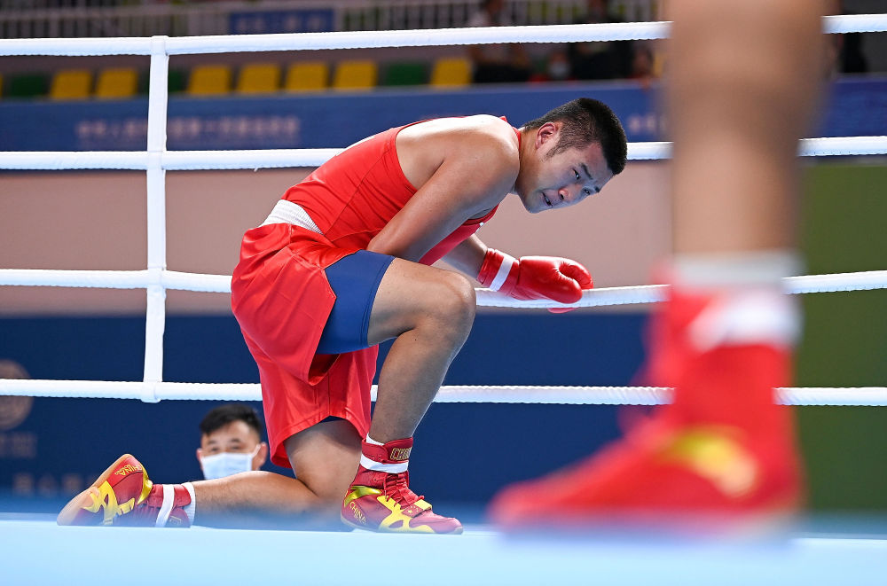 ↑2021年9月18日,廣東隊選手馬金陽(左)在男子91公斤以上級半決賽中被擊倒。