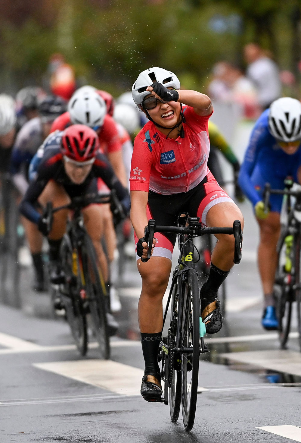 ↑2021年9月26日,香港隊選手李思穎在公路自行車女子個人賽決賽中率先沖過終點,獲得冠軍。