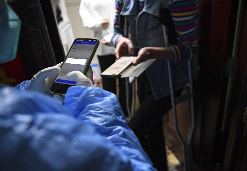 ↑2021年10月23日,在寧夏銀川市金鳳區北京中路街道采樣點,醫務人員(左)在掃碼登記居民信息。
