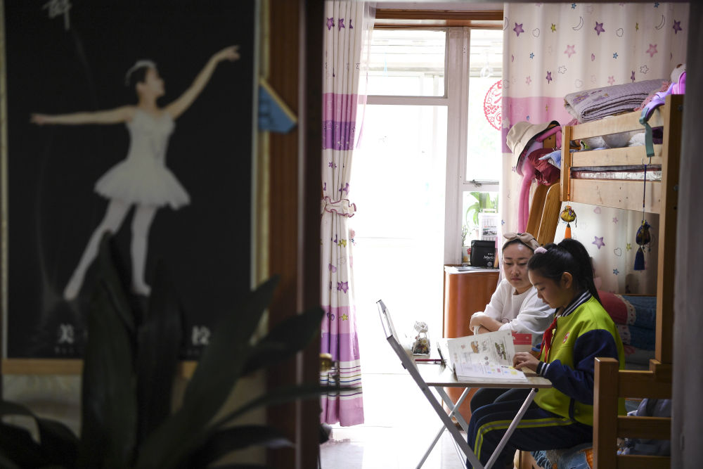 ↑2021年10月25日,寧夏銀川市五年級學生安思雯(右)在媽媽的陪伴下學習線上課程。