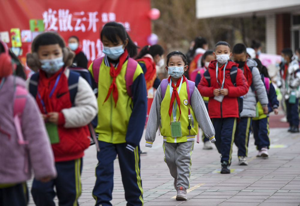 ↑2021年11月25日,寧夏銀川市興慶區第四小學學生重返校園。