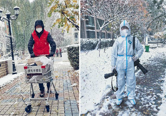 ↑左圖為2021年11月6日上午,新華社記者馮開華在銀川市興慶區一處隔離小區做志愿服務;右圖為2021年11月6日下午,新華社記者馮開華在銀川市金鳳區一處中風險社區采訪。