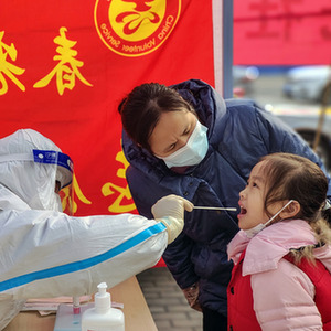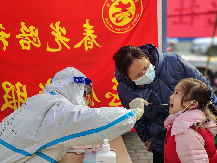 在安陽市文峰區紫薇大道街道春光路社區,醫護人員為一名小朋友進行核酸檢測取樣(1月11日 麻翛然攝)