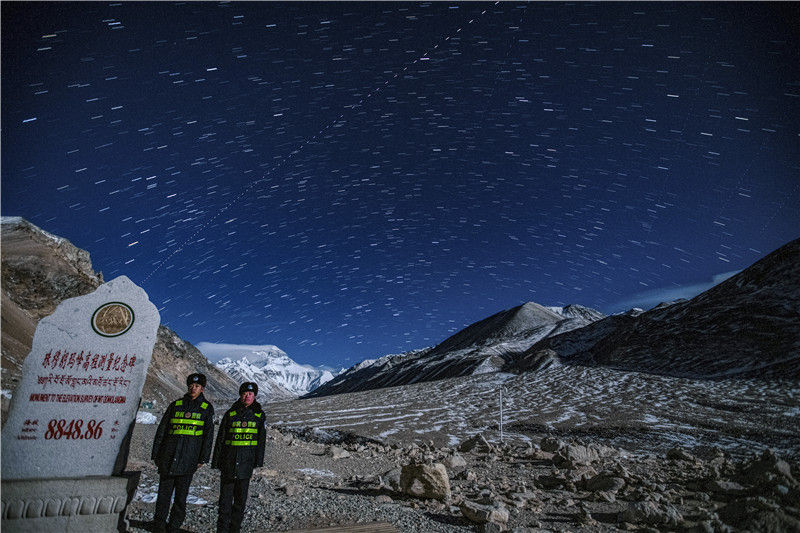 在西藏日喀則,仰望星空,“追星人”打卡珠峰高程測量紀念碑。當中國空間站飛越珠峰上空時,移民管理警察宋鑫攝影創作出一場“天宮”奇觀,堆棧軌跡劃破瀑布般的銀河,呈現科幻視覺盛宴。