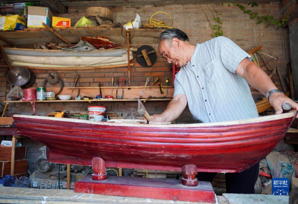 河北雄安新區安新縣馬家寨村人劉廣玉在制作木船模型(2019年7月25日攝)。新華社記者 邢廣利 攝