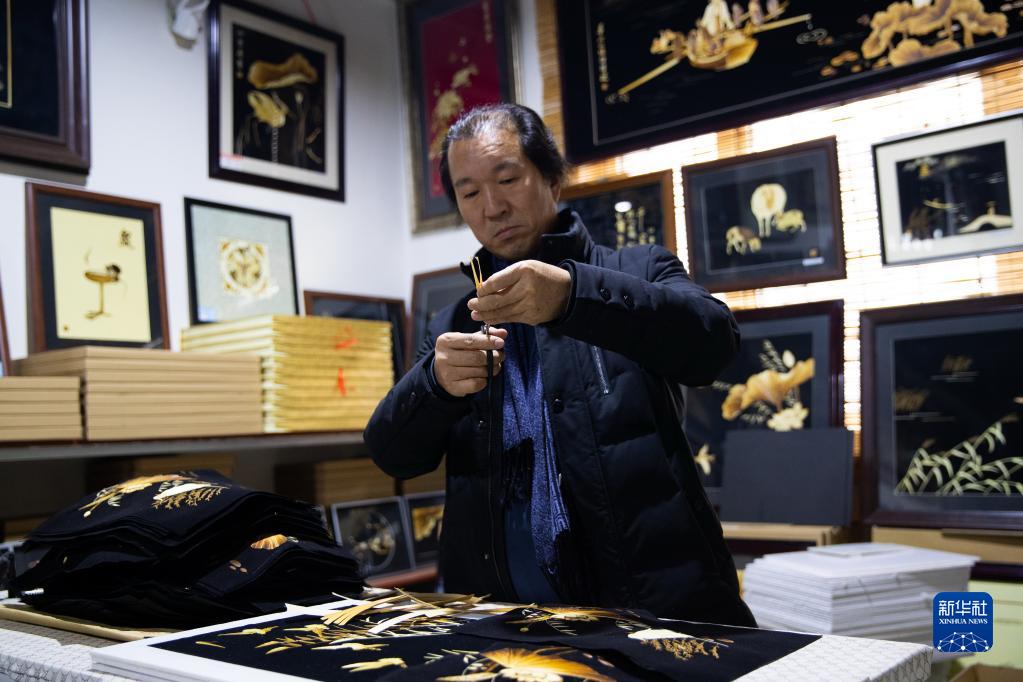 河北省非物質文化遺產蘆葦畫技藝傳承人楊丙軍在制作蘆葦畫(2019年1月8日攝)。新華社發(王京卓 攝)