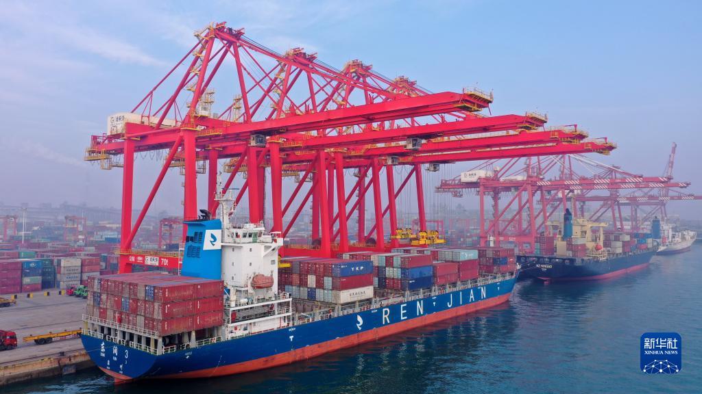 1月26日,貨輪??吭谏綎|日照港集裝箱碼頭進行裝卸作業(無人機照片)。新華社記者 郭緒雷 攝