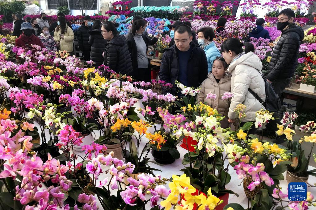 1月16日,顧客在青島市嶗山區一花卉市場“年宵花節”上挑選鮮花。新華社記者 李紫恒 攝