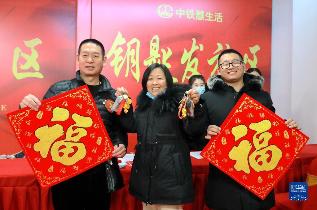1月17日,即將入住雄安新區容東片區E組團安置房的居民展示鑰匙。新華社發